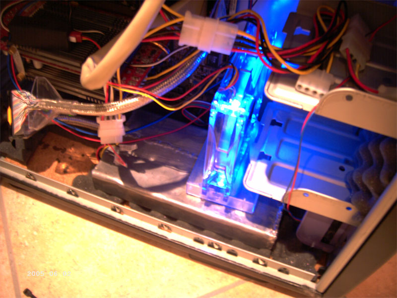 Ist dies geschehen, ist eigentlich auch schon ein Großteil der Arbeit erledigt. Als nächstes habe ich die HDD auf der Unterseite und auch etwas um den Rand ragend mit einer Folie beklebt, da ich so einen Kontakt zwischen dem Blei und der Platine vermeide und so einen möglichen Kurzschluß ausschießen kann. Die Platte wird nun vorsichtig in den Schacht geschoben, am besten man montiert IDE und Stromkabel (auch hier würde sich ein Stromverlängerungskabel empfehlen) direkt mit der Platte, bis man gegen das Ende stößt. Die einzige Schallaustritts-Stelle ist nun noch eben das Loch, durch welches die HDD geschoben wurde. Wie man nun weiter vorgeht bleibt wieder euch überlassen, je nachdem was ihr für Material rumliegen habt. Ich hatte noch etwas Akustik Noppenschaum der sich gut formen und quetschen lässt und so viel Schall schluckt. Möglich wäre aber auch hier mit Bitumen oder Ähnlichem zu arbeiten. Sorry wegen der schlechten Qualität der Nahaufnahme: Optional: Zu guter letzt wird das Blei rund um die HDD noch einmal kräftig angedrückt. Sollte sich dabei herausstellen dass Ihr zuviel Luft drin habt, könnt ihr auch, bevor Ihr mit Schaumstoff dichtmacht, nochmal eine kleine Schicht Blei über die HDD schieben, nachdem Ihr die Seiten schön angedrückt habt. Fertig ist die Konstruktion! Hier noch einmal Bilder des fertigen Werkes, ich bitte das Kabelchaos zu entschuldigen. Der provisorisch daraufgestellte Lüfter dient nicht zur Kühlung der Box sondern zur Kühlung der Grafikkarte links im Bild. Es ist wie gesagt eine Alternative die gewisse Vorteile und auch Nachteile gegenüber der Bit-Box mit sich bringt. Vorteil: Nachteil: - Blei schwer zu besorgen Ergebnis: kurz gesagt....beindruckend :D Vibration aufgrund der großen Masse des Blei´s fast vollständig verschwunden. Ich habe die Konstruktion einfach auf dem Schaumstoff gelegt mit dem mein Gehäuseboden ausgekleidet ist. Gekühlt wird alles durch den vorne eingebauten Papst 12db Lüfter der @5v leise vor sich hinläuft. Die Temp im Idle Modus hat sich bei 27C° eingependelt bei ca. 19-20Grad Umgebungstemp. Unter Last erreiche ich Temps von 30-32 C°. Beim HDD Modell handelt es sich um eine Samsung SpinPoint P80 SP1614N mit lautem JVC Motor. Viel Spaß beim nachbauen....