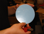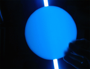 Dies stellte sich als leichter heraus wie von mir zu Beginn befürchtet. Die kleineren Unebenheiten, die vor allem dadurch entstanden, dass das Plexiglas aufgrund der hohen Temperaturen beim Schneiden anschmolz , wurden von mir mit einer Feile nachbearbeitet und anschließend mit zunehmend feinerem Sandpapier endgültig in Form gebracht. Sehr kleine Verformungen lassen sich leider nur schwer vermeiden. In der Mitte ein Bild eines fertigen Kreises, rechts mit entsprechender Beleuchtung.
