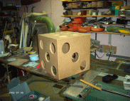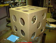 Um dies zu verwirklichen mussten wir schon einmal vorab berechnen wie wir die Augen am besten auf dem Würfel verteilen, welche Seiten oben liegen, welche nicht etc. Wir haben uns nun für Löcher mit einem Durchmesser von 12cm entschieden, um jedes Loch werden wir mit einer Oberflächenfräse einen ein paar mm breiten und tiefen Rand fräsen, so dass das später aufgelegte Plexiglas bündig mit der Oberfläche aufliegt.