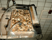 Das Bild zeigt hier den Radiator, mehrere Lüfter finde mühelos Platz auf dem Ganzen. Wir werden das ganze höchstwahrscheinlich lackieren und beleuchtete Lüfter darauf schrauben. Hier noch einmal das Bild der Pumpe, sie wird in diesem Becken, dass wir mit Kies angefüllt haben, versenkt. Ein paar Leute werden sich jetzt fragen, wass diese dämliche Plastikkonstruktion über der Pumpe zu bedeuten hat, dies hat folgenden Grund: Im Kies befinden sich noch allerhand winziger Steinchen, sollten diese zufälligerweise in die Pumpe gelangen, könnten diese die Pumpe zerstören, durch viele kleine Löcher fliesst genug wasser nach und die Pumpleistung wird nicht beeinflusst.