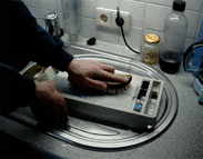 Hier sieht man Veltins, wie er mit einem Schleifgerät die letzen Lackreste vom Tower entfernt. Die aus Plastik bestehenden Frontstücke werden selbstverständlich ebenfalls lackiert, egal ob eine Grundierung nun notwendig ist oder nicht, die Kunststoffstücke müssen auf jedem fall sauber und fettfrei sein, deswegen wurden sie von RiGO gründlich gewaschen, Ich werde sie bevor ich sie zur möglichweise nötigen Grundierung gebe noch einmal mit Alkohol reinigen.