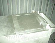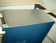 Jetzt folgten die beiden Gehäusedeckel, an der sich jeweils noch eine Seitenwand befindet. Da wir inzwischen merkten, dass die blaue Farbe knapp wird, bzw. nicht ausreichen würde, entschlossen wir uns, wie auch damals ursprünglich geplant, die Deckel ebenfalls in chrom zu lackieren. Hierzu klebten wir das Ganze wieder in 2 Bereiche ab, und begannen mit der blauen Seitentür anschließend erfolgte die letzte Lackierung, nämlich die chromfarbene Deckellackierung. Am Ende sah das Ganze dann so aus: