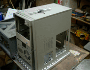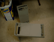**** Casemod : BLUE LIGHTNING - Der Aufbau**** *** UPDATE 25.03.2004 *** Der Clan hat wieder etwas Zeit gehabt, was ja in der letzen Zeit zunehmend zu einem Problem wird (--> ABI) . Naja auf jeden Fall hat sich einiges getan, auch wenn es auf den Bildern nicht ganz so rüberkommt. Der wichtigste Schritt dürfte auf jeden Fall die gründliche Grundierung der Tower und der Seitenteile sein. Leider kommt das ganze aufn Photo etwas unscharf rüber. Die Tower hat mein Vater mit zur Arbeit genommen, da dort ein für uns ausreichender Lackierraum mit Absauganlage vorhanden ist. Auf den Towern sieht man nun eine dunkelgraue matte Oberfläche die sich leicht rauh anfühlt und idealen Haftgrund für den nun bald folgenden blauen Lack bildet. Wir benutzen Epoxydharz , da , so wie ich das verstanden habe, mit normaler Verdünnung die Grundierung nicht mehr haften würde, bzw. sich anlösen würde, wenn wir mit den Spraydosen, die ja die gleiche Verdünnung verwenden , auf die Oberfläche sprühen. Hier sind auf jeden fall die grundierten Tower, der Kunststoff wurde ebenfalls grundiert: