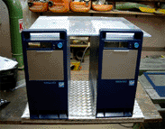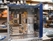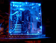 **** Casemod : BLUE LIGHTNING - Der Aufbau**** **** UPDATE VOM 14. in den 15.***** Bearbeitung der Gehäuse und deren Befestigung Bis 0 ³°Uhr haben wir jetzt bei Veltins noch gesessen und an den Casemods weitergearbeitet. Und ich kann mit Stolz sagen, dass wir wirklich viel geschafft haben. Zuerst haben wir die bis dahin noch lose rumliegenden Gehäusehüllen mit den beiden Gehäusen verschraubt, wie es vorgesehen war. Danach richteten wir die Gehäuse auf der Bodenplatte so aus, dass an den Seiten kein Holz mehr zu sehen ist. Nun musste die bis dahin nur grob zugeschnittene Plexiglasscheibe , die oben einen Abschluss bilden soll , noch weiter zugeschnitten werden, so dass an den Rändern nichts übersteht. Gleichzeitig bohrten wir auch die passenden Löcher in die Scheibe, damit sie später gut befestigt werden kann. Die Schutzfolie haben wir aber aus Gründen des Kratzschutzes beim Arbeiten aber noch nicht abgezogen, obwohl ich zugeben muss, das Rigo und ich das Ganze auch gern mal ohne gesehen hätten. ;-) Danach überlegten wir kurz, ob wir die übriggebliebene Plexischeibe nun vorne als Abschluss benutzen sollten sowie hinten am Gehäuse oder ob wir die dicke Platte zunächst für die Window Seitentüren benutzen sollten. Wir entschieden und für das Zweitere. Nachdem wir diese ebenfalls passend zugeschnitten hatten und ich die Metallstücke mit einem normalen Fön gründlich aufgeheizt hatte, damit der Heißkleber auf dem kalten Metall nicht sofort abkühlt und aushärtet, setzten wir die Scheiben auf und schmierten noch eine dicke Schicht Kleber an den Rand der Platte um sie noch besser zu befestigen. Auch hier haben wir noch eine Schutzfolie drangelassen.