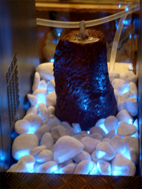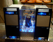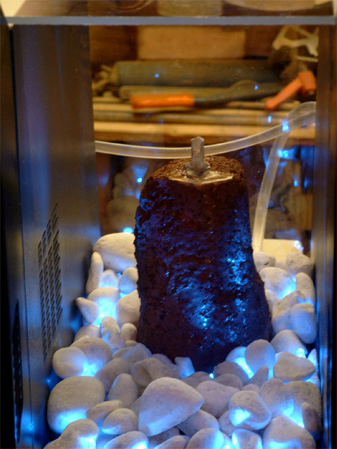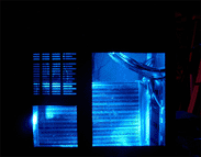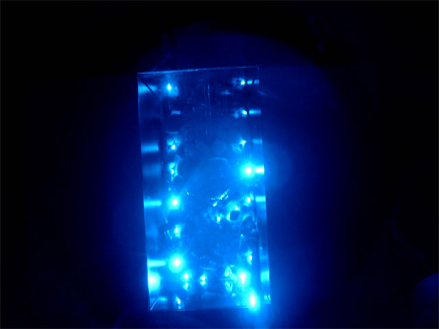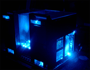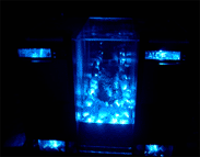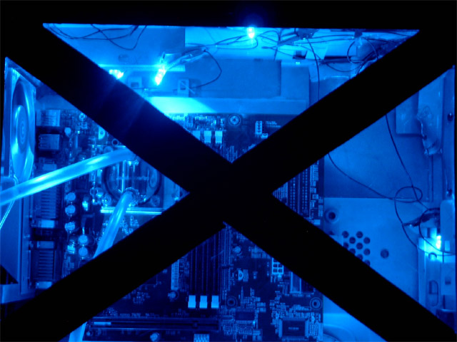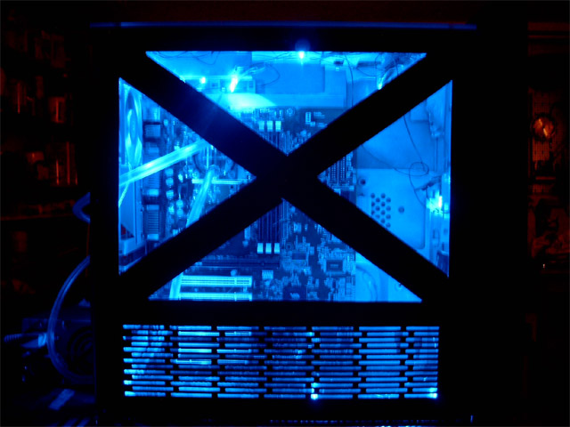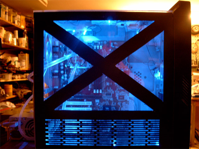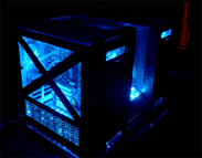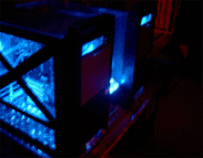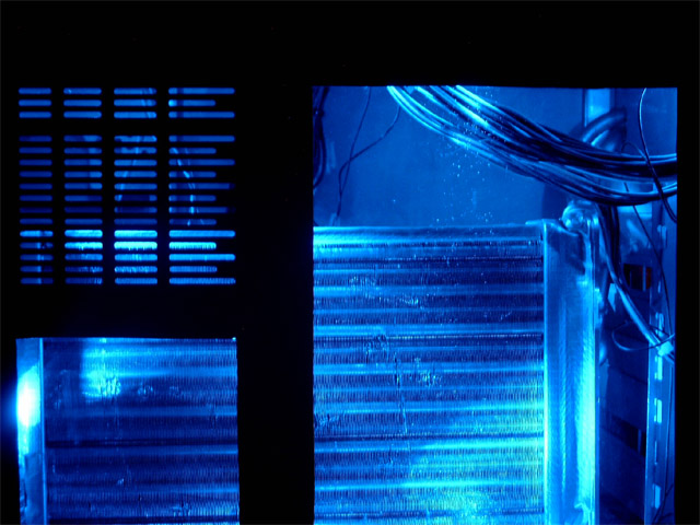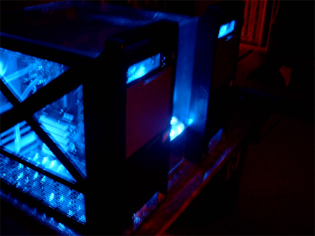 **** Casemod : BLUE LIGHTNING **** Ich hoffe jeder von euch hat unser "Projekt Blue Lighting " durchlesen ;-) und hat den Bau schon von Anfang an mitverfolgt. Da wir uns aber gedacht haben, dass es fast unzumutbar ist jemanden die 20 Seiten Herstellungsgeschichte zu zeigen, wenn er nur an fertigen Ergebnissen interessiert ist, werde ich nun hier ein neues Blatt aufmachen, in welchem einfach nur das "fertige Projekt" vorgestellt wird. Natürlich gibt es hier und da noch eine Kleinigkeit zu verbessern, das alles aber noch hier aufzuzählen ist sinnlos und erfüllt auch nicht seinen Zweck. So werden z.B. noch einige verchromte Lüfter vor den Radiator gesetzt. Nun zum Projekt: Idee: 2 identische Gehäuse (aus der guten alten IBM Monopol Zeit) werden auf einer Bodenplatte befestigt und durch Kabel miteinander verbunden. In dem entstehenden Freiraum wird eine "offene Wasserkühlung" in Form von einem grossen Steinbecken betrieben. Das Ganze ist durch Plexiglas-Scheiben vorne, hinten und durch den Deckel geschützt. In den Seiten werden Fenster aus Plexiglas eingebaut. Der eine Tower fungiert als Strom und Kühlturm durch den grossen Radiator, im anderen Tower sind die üblichen Hardwarekomponenten untergebracht. Hier sind die Bilder: