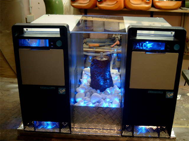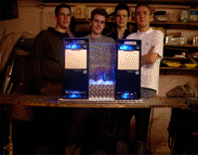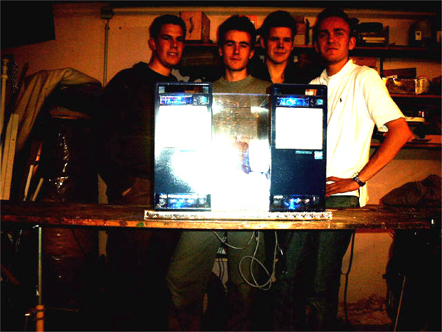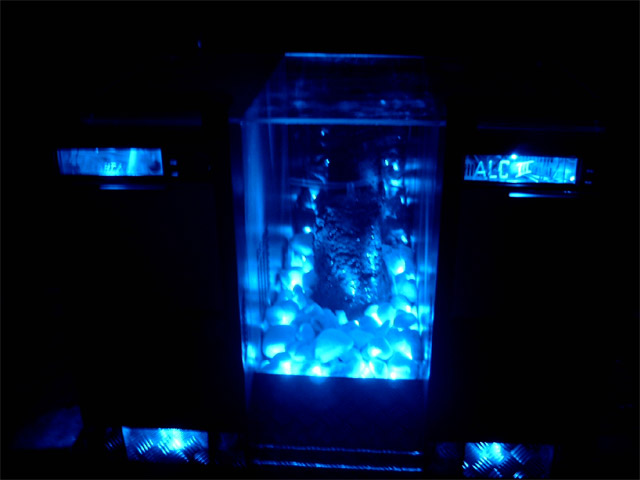 Hier das Ganze noch einmal im Dunkeln. Links ein weiteres Photo vom Stein , in der Mitte , rechts sowie in den unteren Bildern der erwähnte Radiator und die CPU Kühlung... Hier der andere Tower mit dem installierten Board Das rechte Bild zeigt das Ganze aus der Vogelperspektive, Ihr seht den mittleren Freiraum mit dem Stein. Weitere Bilder vom Becken und dem Stein. Rechts : Die vorderen freigebliebenen 3,5" Schächte haben wir mit Plexiglas versiegelt und die Schriftzüge "ALC III (3. Modding Projekt) " und "Blue Lightning" eingraviert. Links könnt ihr den Schriftzug vom linken Gehäuse sehen (Beschwerden über die Gravur bitte an Jägermeister :-p ) Die restlichen Bilder brauchen nicht näher erläutert zu werden. Ich denke dass könnt Ihr auch so erkennen. Vielen Dank fürs Durchlesen , falls Ihr an den einzelnen Details interessiert seid, dann lest euch doch "DIE AKTE BLUE LIGHTNING" durch. Dort findet Ihr die gesamte Dokumentation des Projektes in ausführlicher Form mit vielen Bildern von dessen Entstehung. Ihr müsstet nur etwas Zeit mitbringen, denn die Dokumentation ist wirklich sehr umfangreich und stellt unsere bisherige Quantität an Doku locker in den Schatten. Mit diesen Worten verabschiedet sich der ALC CLAN vorerst aus der Casemodding-Szene..Sollten wir irgendwann einmal wieder Zeit für ein größeres, gemeinsames Projekt haben das durch bisher nie dagewesenen Features glänzt, werden wir es Euch rechtzeitig wissen lassen! Von links nach rechts und auch in 70s Version :-p Veltins, Frankenheimer, RiGO, Jägermeister